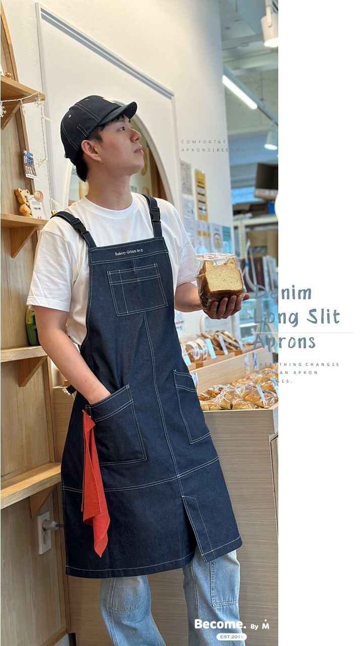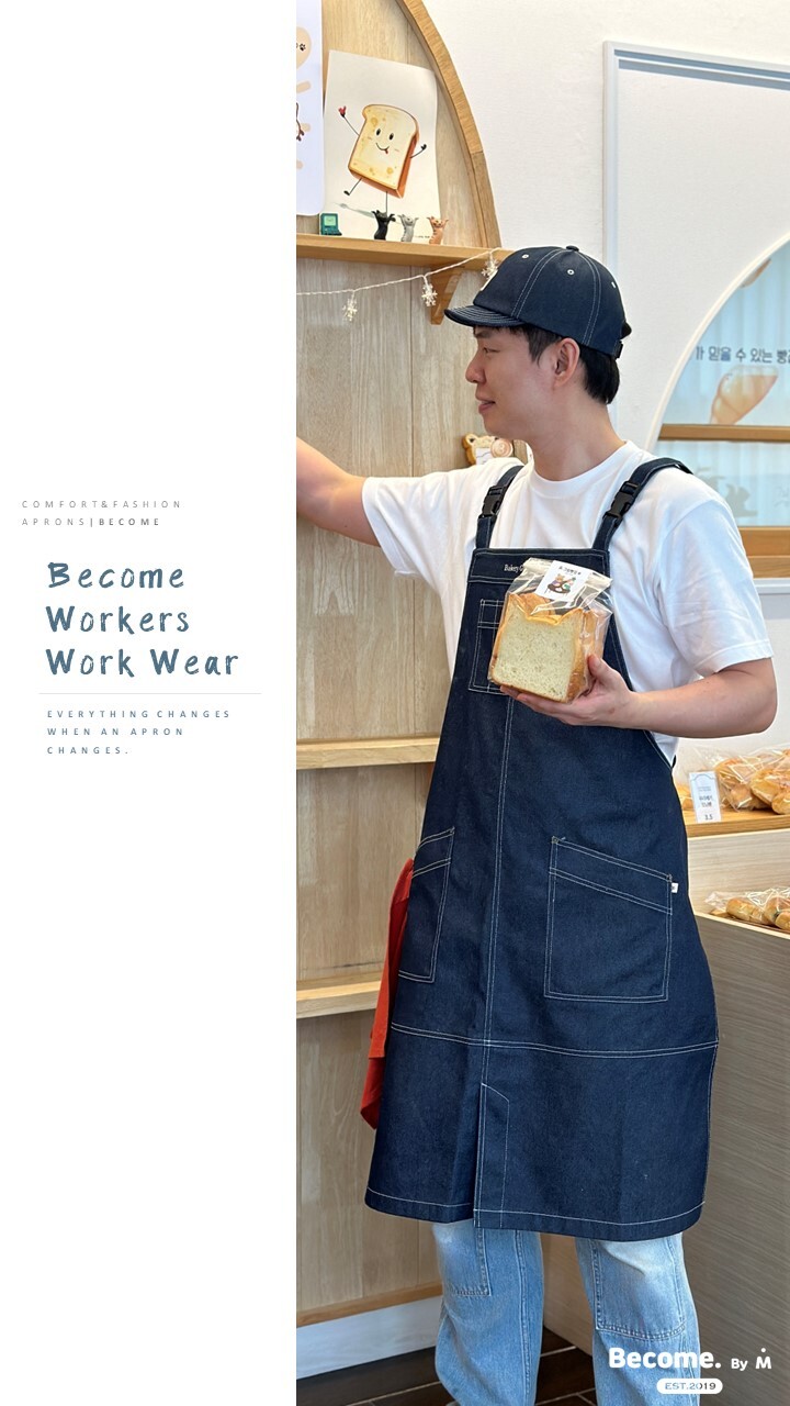 포인트 배색 화이트 스티치사를 사용하여 데님 에이프런의 힙한 감성을 표현하였습니다. 가슴 상단의 볼펜 포켓과 수납포켓은 다양한 용품의 수납이 가능합니다. 수납기능과 편안한 자세를 취할 수 있는 하단 양면 포켓으로 제작되었습니다. H 밴드 스타일 제품으로 하루종일 착용하는 작업환경에서 어깨나 목에 무리가 가지 않아 편안 합니다. 어깨끈은 착용자의 체형에 따라 손쉽게 조절이 가능합니다.