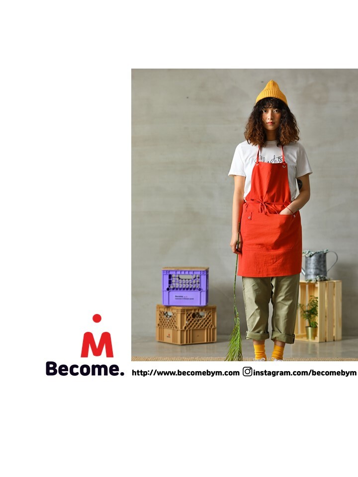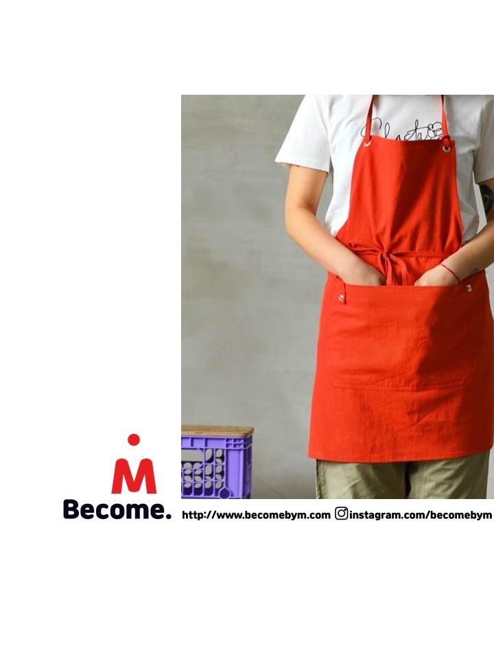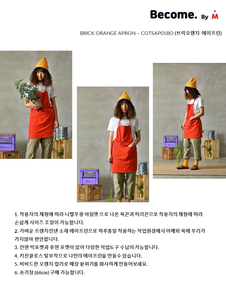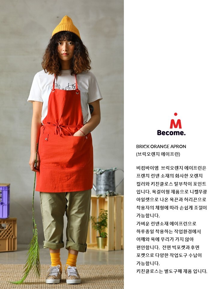 비컴바이엠 브릭오렌지 에이프런은 프렌치 린넨 소재의 화사한 오렌지 컬러와 키친클로스 탈부착이 포인트 입니다. 목걸이형 제품으로 니켈무광 아일렛으로 나온 목끈과 허리끈으로 착용자의 체형에 따라 손쉽게 조절이 가능합니다.