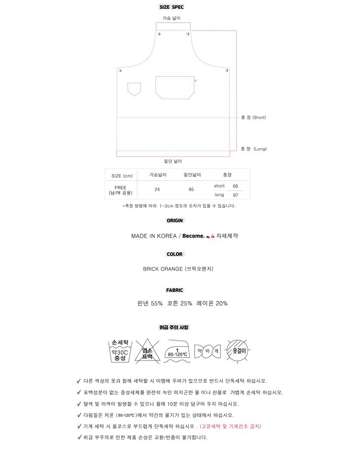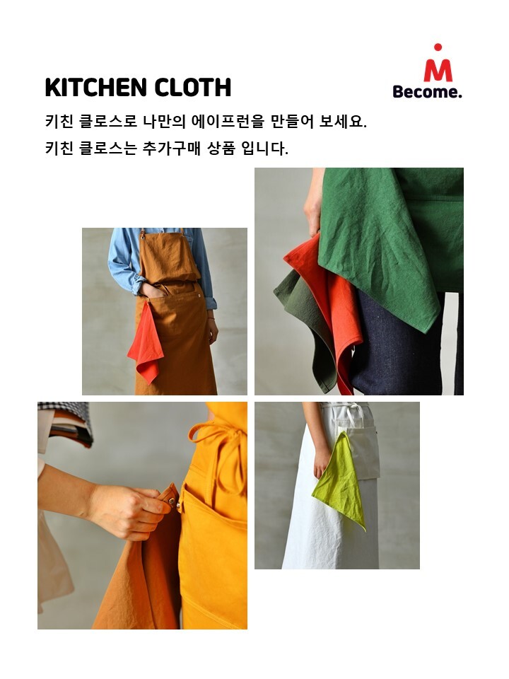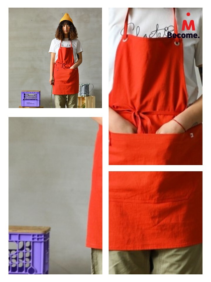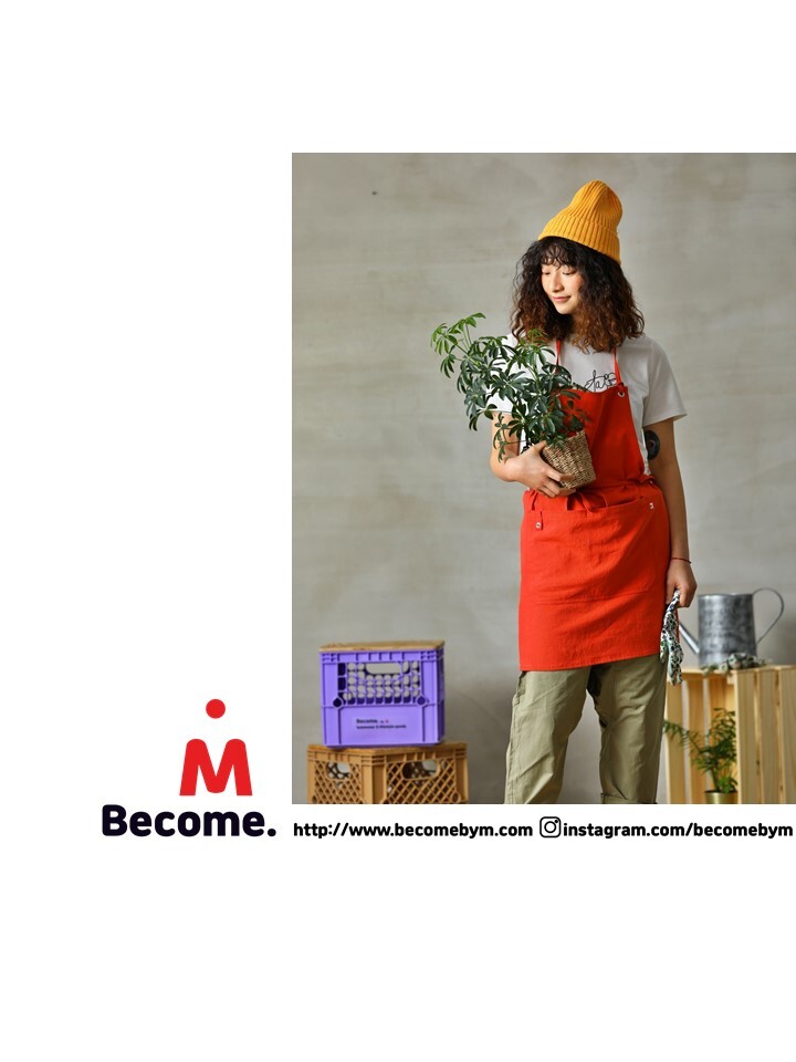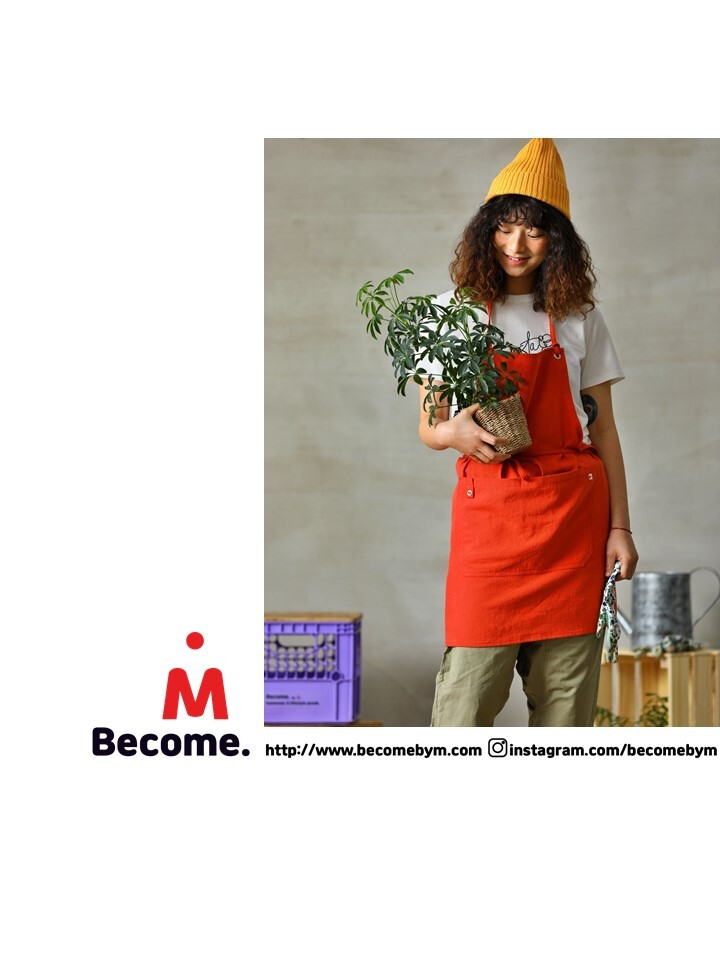 비컴바이엠 브릭오렌지 에이프런은 프렌치 린넨 소재의 화사한 오렌지 컬러와 키친클로스 탈부착이 포인트 입니다. 목걸이형 제품으로 니켈무광 아일렛으로 나온 목끈과 허리끈으로 착용자의 체형에 따라 손쉽게 조절이 가능합니다.