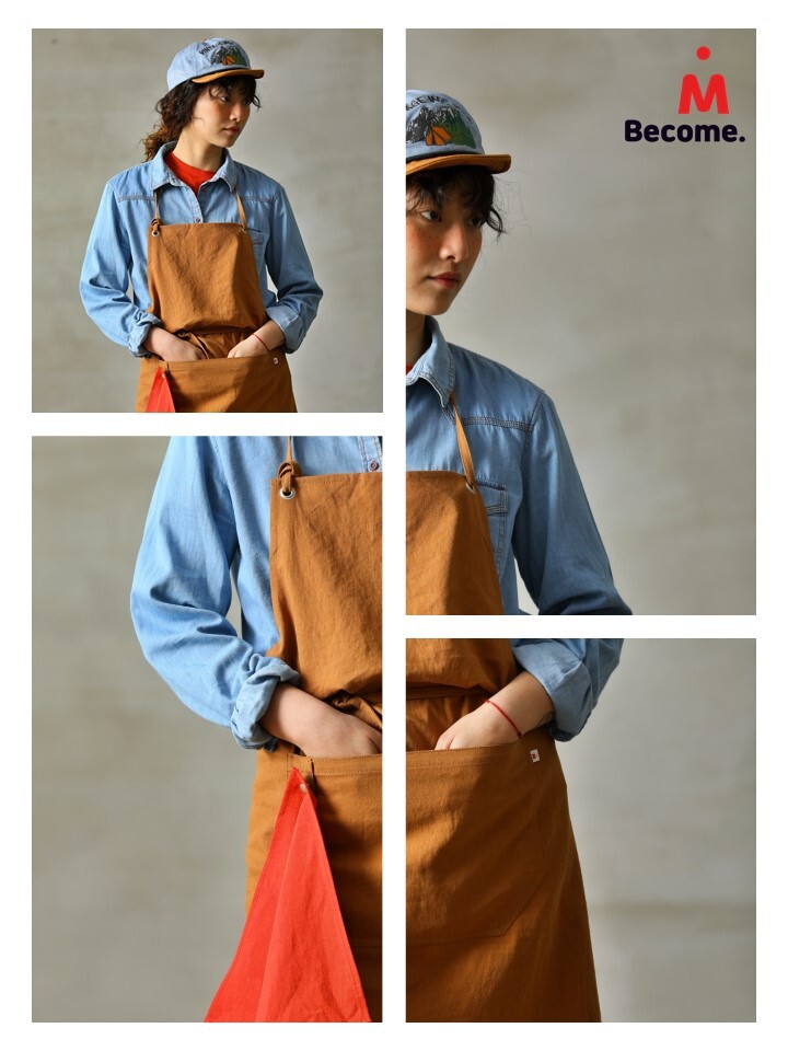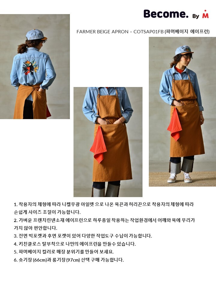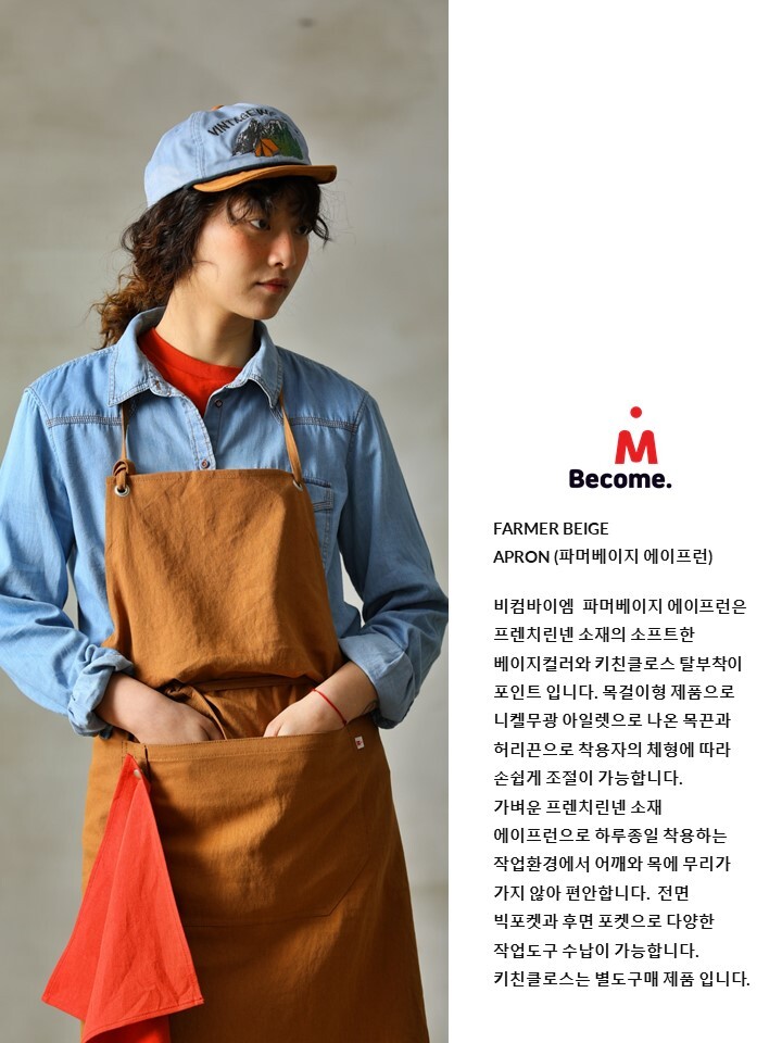 비컴바이엠 파머베이지 에이프런은 프렌치린넨 소재의 소프트한 베이지컬러와 키친클로스 탈부착이 포인트 입니다. 목걸이형 제품으로 니켈무광 아일렛으로 나온 목끈과 허리끈으로 착용자의 체형에 따라 손쉽게 조절이 가능합니다.