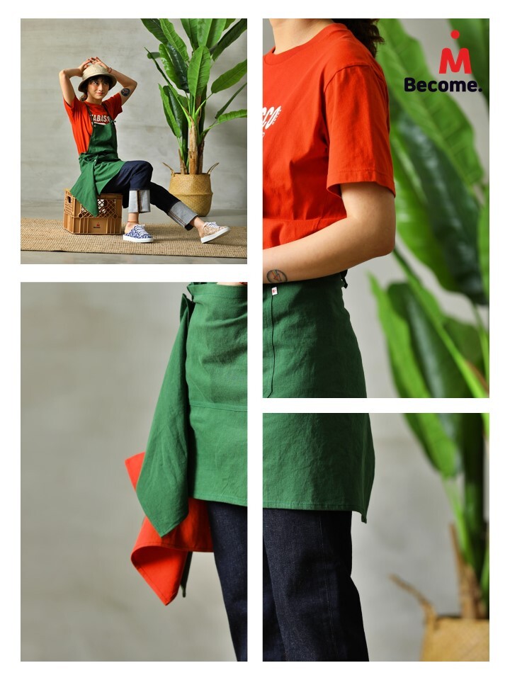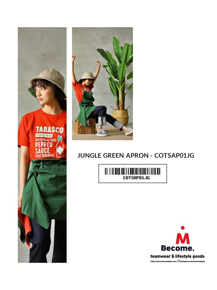 비컴바이엠 정글그린 에이프런은 프렌치 린넨 소재의 정글그린 컬러와 키친클로스 탈부착이 포인트 입니다. 목걸이형 제품으로 니켈무광 아일렛으로 나온 목끈과 허리끈으로 착용자의 체형에 따라 손쉽게 조절이 가능합니다.