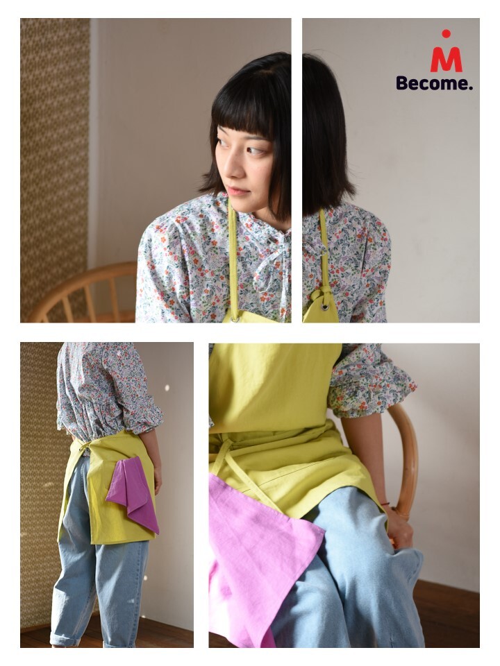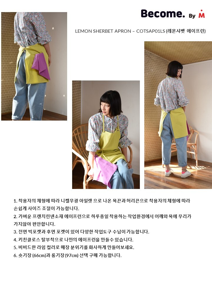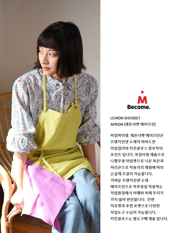 비컴바이엠 레몬샤벳 에이프런은 프렌치린넨 소재의 비비드한 라임컬러와 키친클로스 탈부착이 포인트 입니다. 목걸이형 제품으로 니켈무광 아일렛으로 나온 목끈과 허리끈으로 착용자의 체형에 따라 손쉽게 조절이 가능합니다.