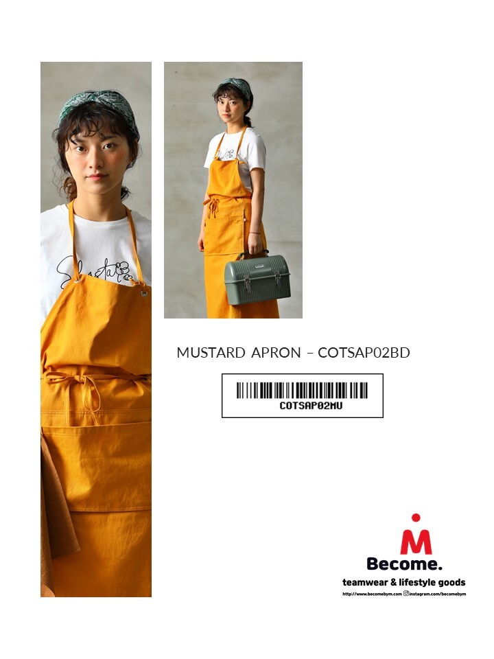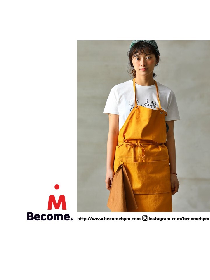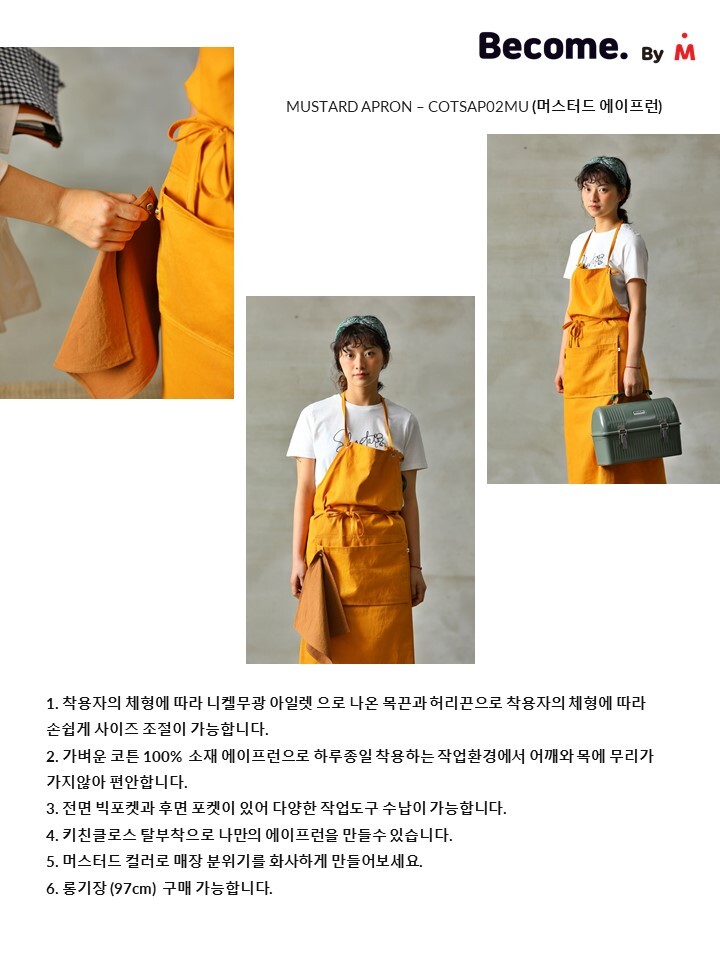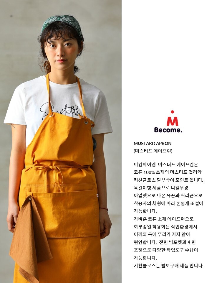 비컴바이엠 머스터드 에이프런은 코튼 100% 소재의 머스터드 컬러와 키친클로스 탈부착이 포인트 입니다. 목걸이형 제품으로 니켈무광 아일렛으로 나온 목끈과 허리끈으로 착용자의 체형에 따라 손쉽게 조절이 가능합니다.