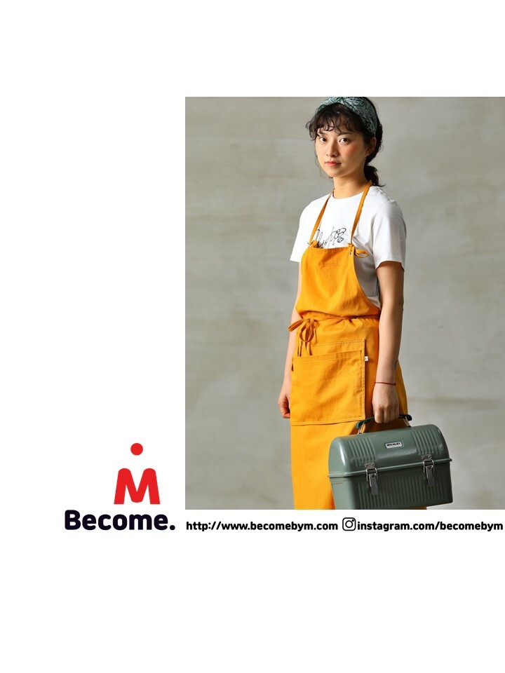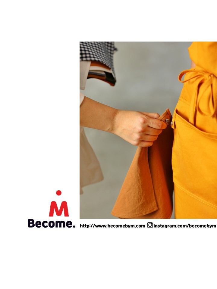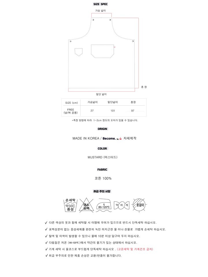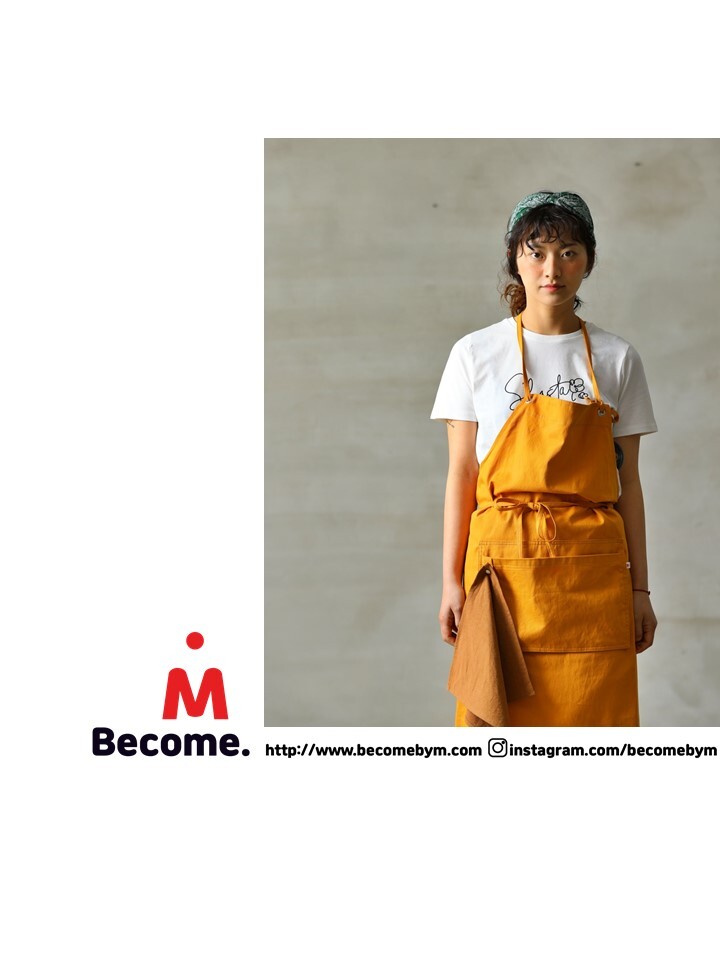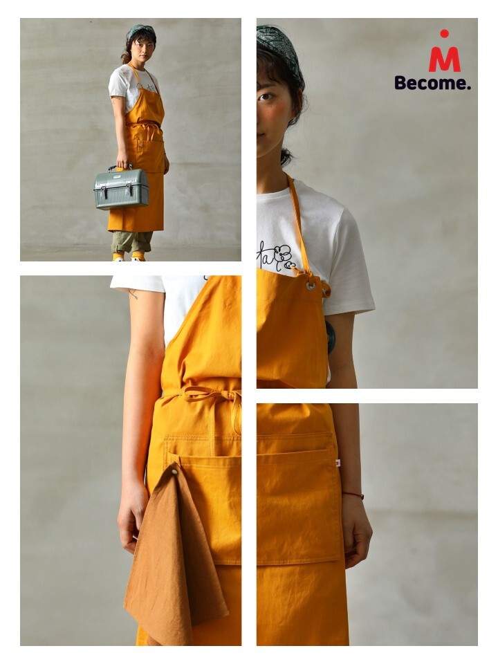 비컴바이엠 머스터드 에이프런은 코튼 100% 소재의 머스터드 컬러와 키친클로스 탈부착이 포인트 입니다. 목걸이형 제품으로 니켈무광 아일렛으로 나온 목끈과 허리끈으로 착용자의 체형에 따라 손쉽게 조절이 가능합니다.