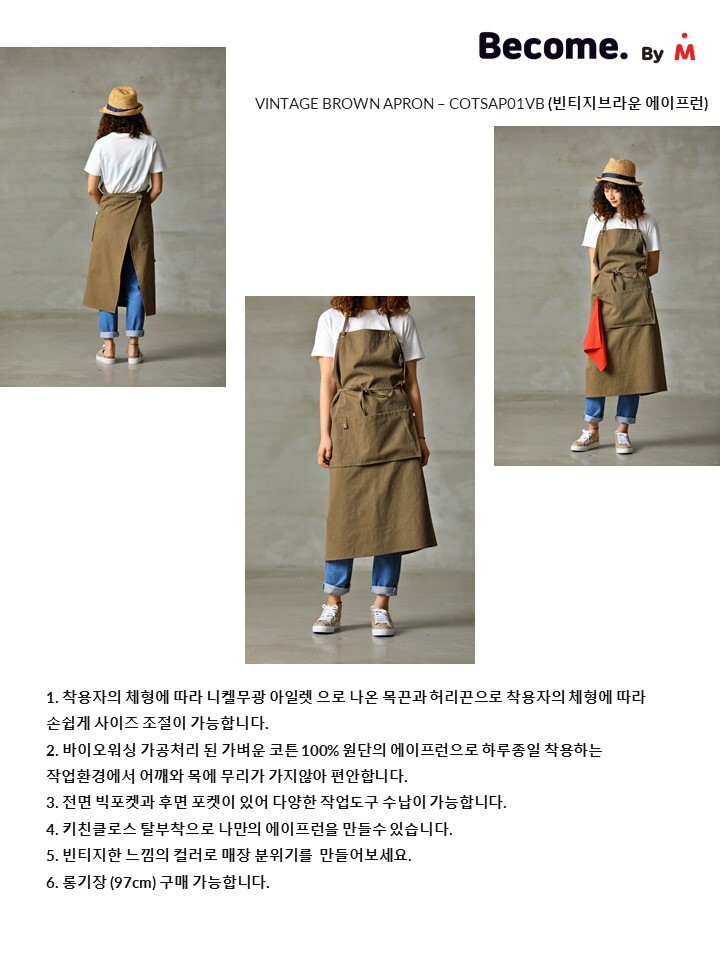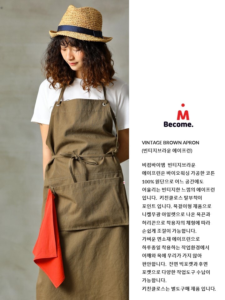 비컴바이엠 빈티지브라운 에이프런은 바이오워싱 가공한 코튼 100% 원단으로 어느 공간에도 어울리는 빈티지한 느낌의 에이프런 입니다. 키친클로스 탈부착이 포인트 입니다. 목걸이형 제품으로 니켈무광 아일렛으로 나온 목끈과 허리끈으로 착용자의 체형에 따라 손쉽게 조절이 가능합니다.