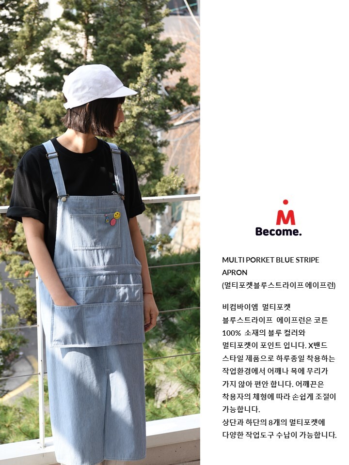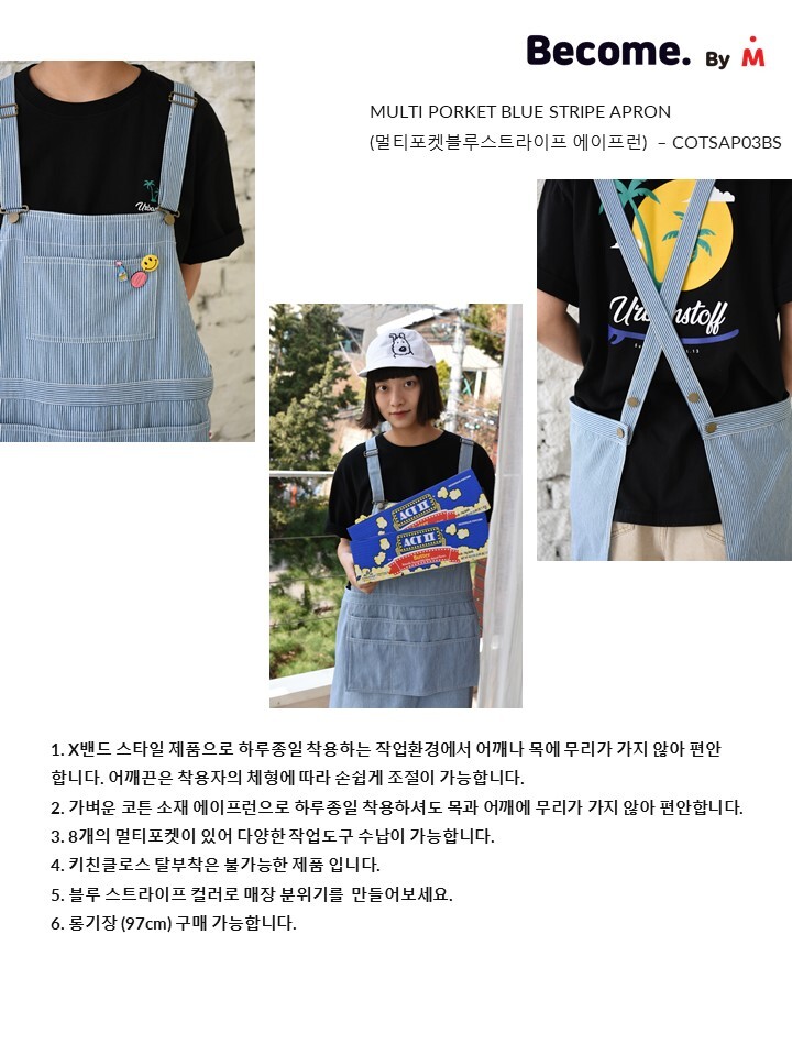 비컴바이엠 멀티포켓 블루스트라이프 에이프런은 코튼 100% 소재의 블루 컬러와 멀티포켓이 포인트 입니다. X밴드 스타일 제품으로 하루종일 착용하는 작업환경에서 어깨나 목에 무리가 가지 않아 편안 합니다. 어깨끈은 착용자의 체형에 따라 손쉽게 조절이 가능합니다.