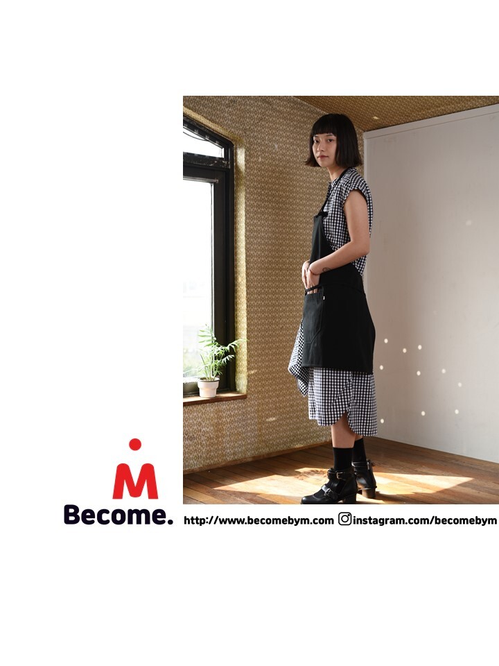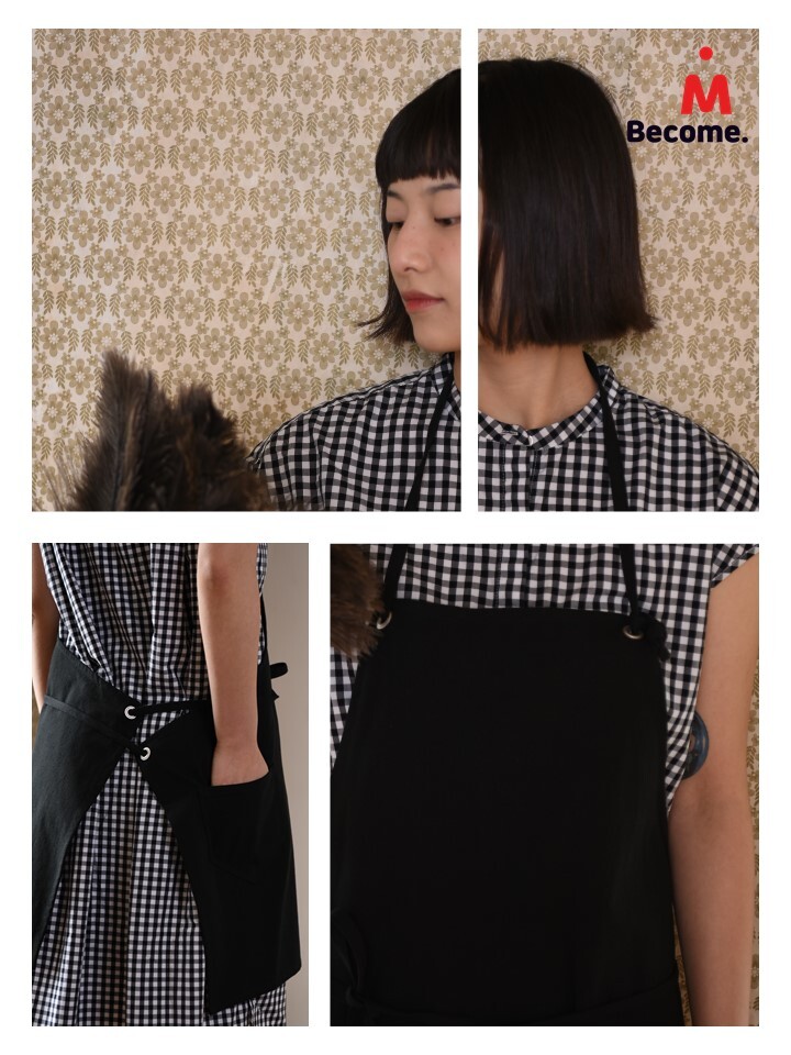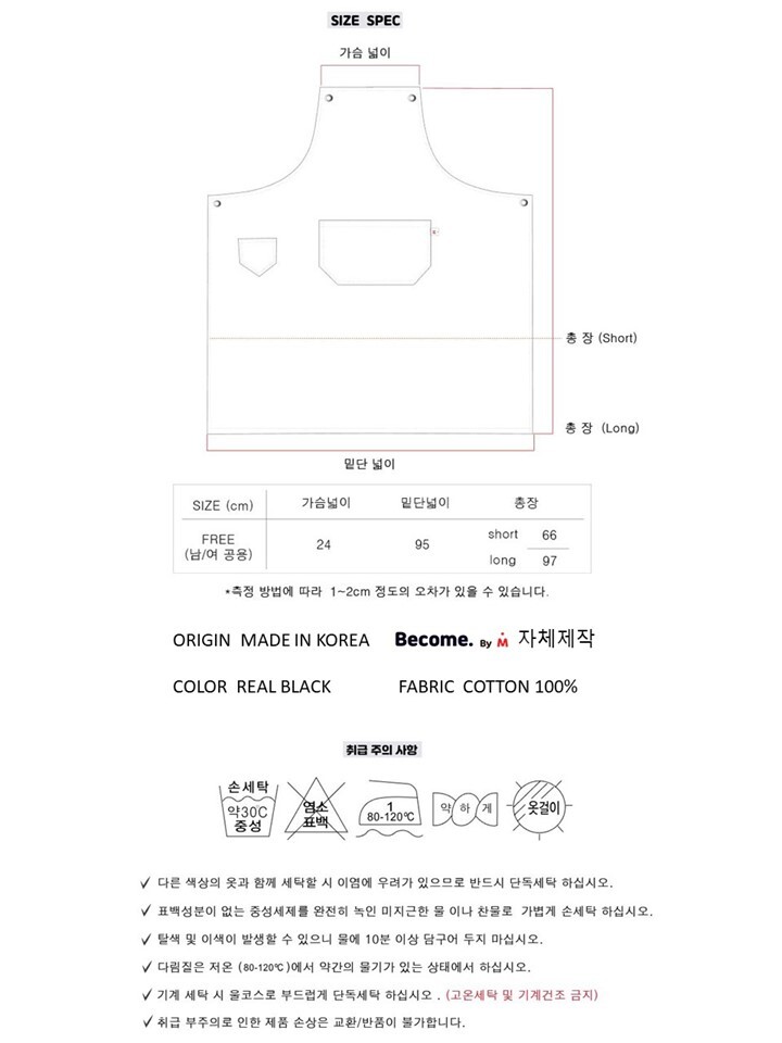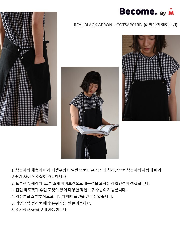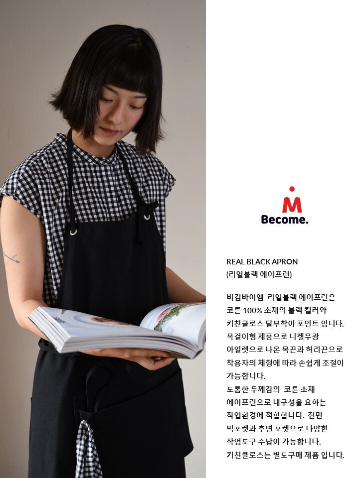 비컴바이엠 리얼블랙 에이프런은 코튼 100% 소재의 블랙 컬러와 키친클로스 탈부착이 포인트 입니다. 목걸이형 제품으로 니켈무광 아일렛으로 나온 목끈과 허리끈으로 착용자의 체형에 따라 손쉽게 조절이 가능합니다.