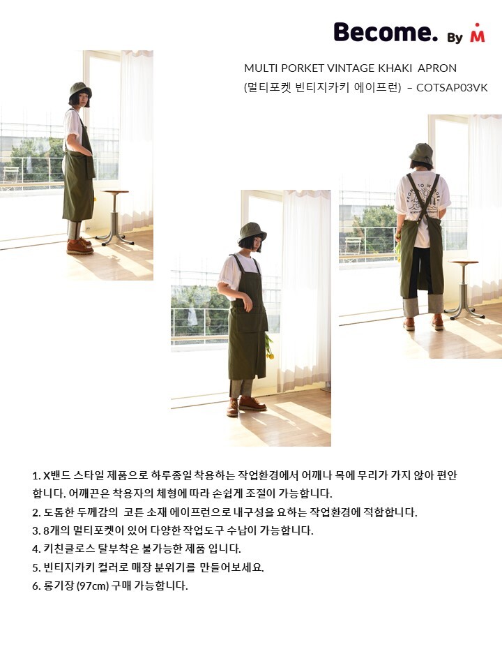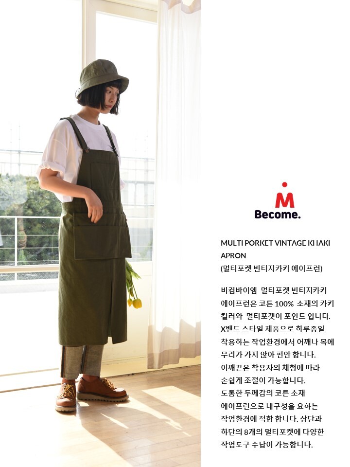 비컴바이엠 멀티포켓 빈티지카키 에이프런은 코튼 100% 소재의 카키 컬러와 멀티포켓이 포인트 입니다. X밴드 스타일 제품으로 하루종일 착용하는 작업환경에서 어깨나 목에 무리가 가지 않아 편안 합니다. 어깨끈은 착용자의 체형에 따라 손쉽게 조절이 가능합니다. 도톰한 두께감의 코튼 소재 에이프런으로 내구성을 요하는 작업환경에 적합 합니다. 상단과 하단의 8개의 멀티포켓에 다양한 작업도구 수납이 가능합니다.