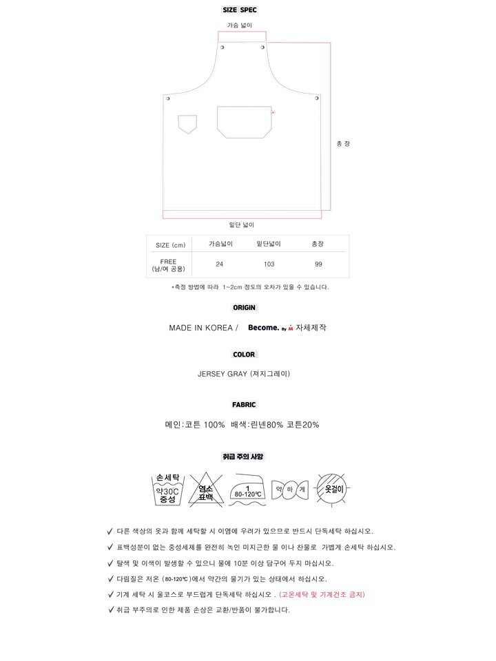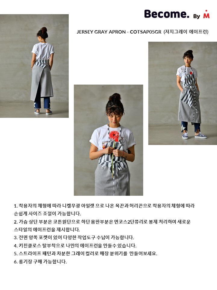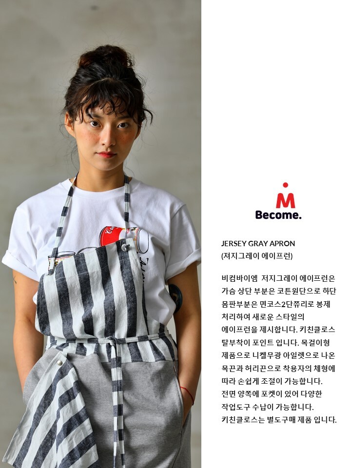 비컴바이엠 저지그레이 에이프런은 가슴 상단 부분은 코튼원단으로 하단 몸판부분은 면코스2단쮸리로 봉제 처리하여 새로운 스타일의 에이프런을 제시합니다. 키친클로스 탈부착이 포인트 입니다. 목걸이형 제품으로 니켈무광 아일렛으로 나온 목끈과 허리끈으로 착용자의 체형에 따라 손쉽게 조절이 가능합니다.