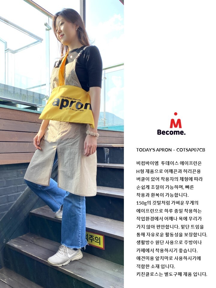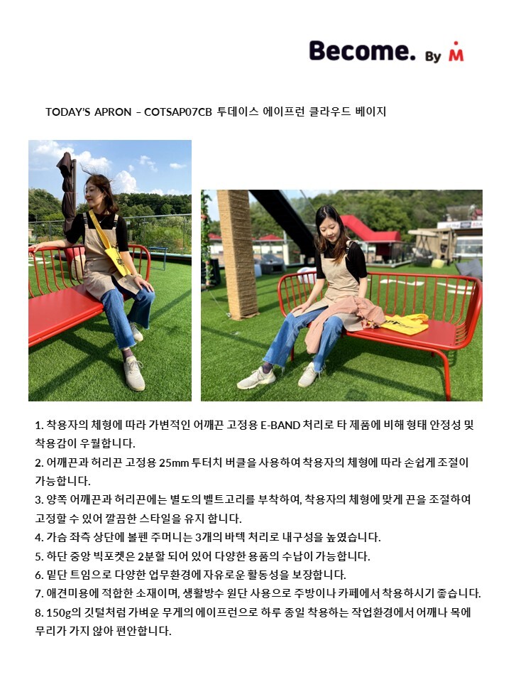 비컴바이엠 투데이스 에이프런은 H형 제품으로 어깨끈과 허리끈용 버클이 있어 착용자의 체형에 따라 손쉽게 조절이 가능하며, 빠른 착용과 환복이 가능합니다.