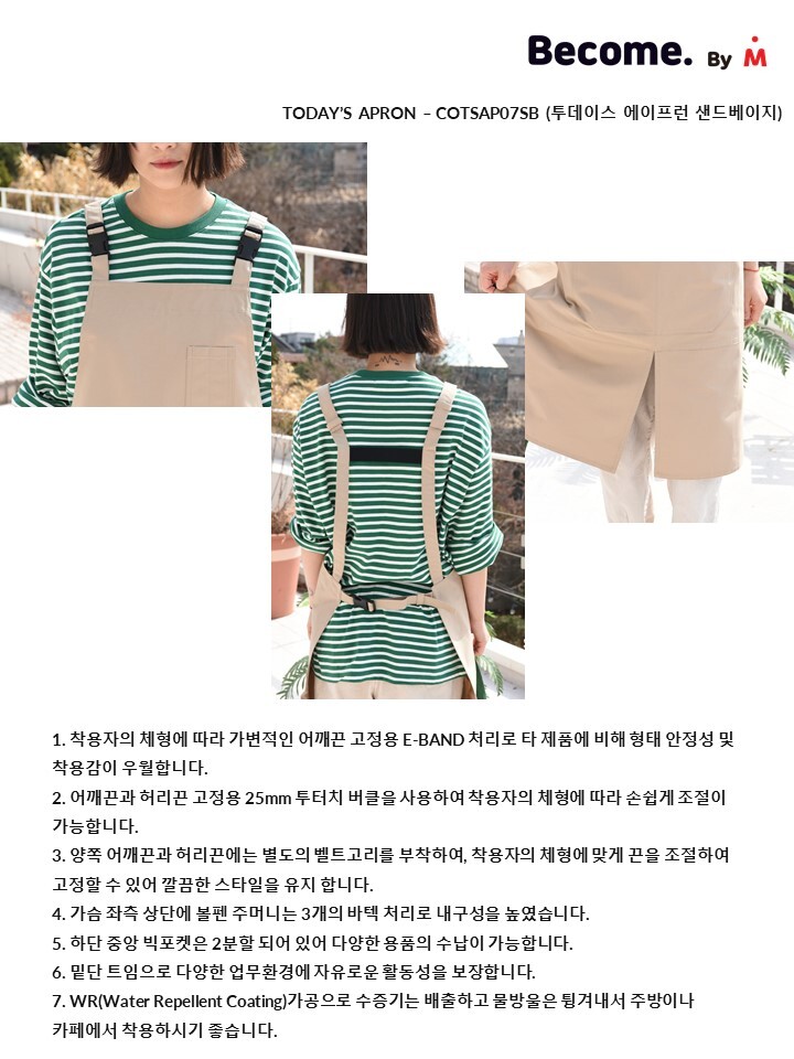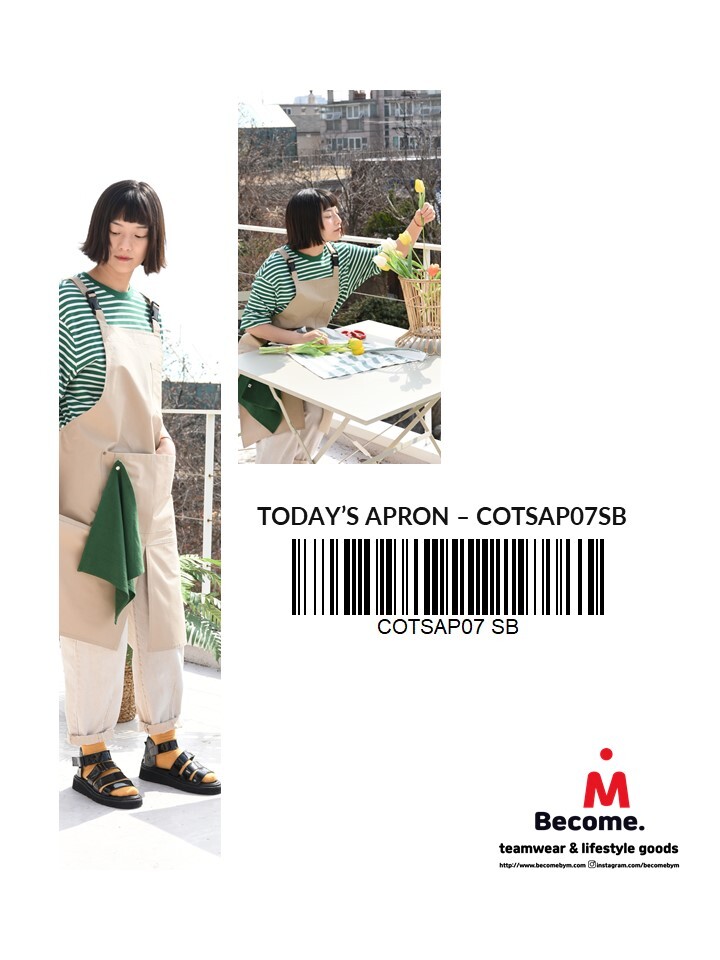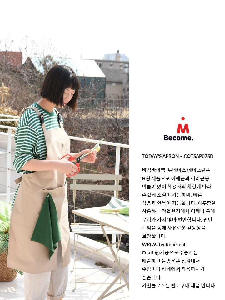 비컴바이엠 투데이스 에이프런은 H형 제품으로 어깨끈과 허리끈용 버클이 있어 착용자의 체형에 따라 손쉽게 조절이 가능하며, 빠른 착용과 환복이 가능합니다. 하루종일 착용하는 작업환경에서 어깨나 목에 무리가 가지 않아 편안합니다. 밑단 트임을 통해 자유로운 활동성을 보장합니다.