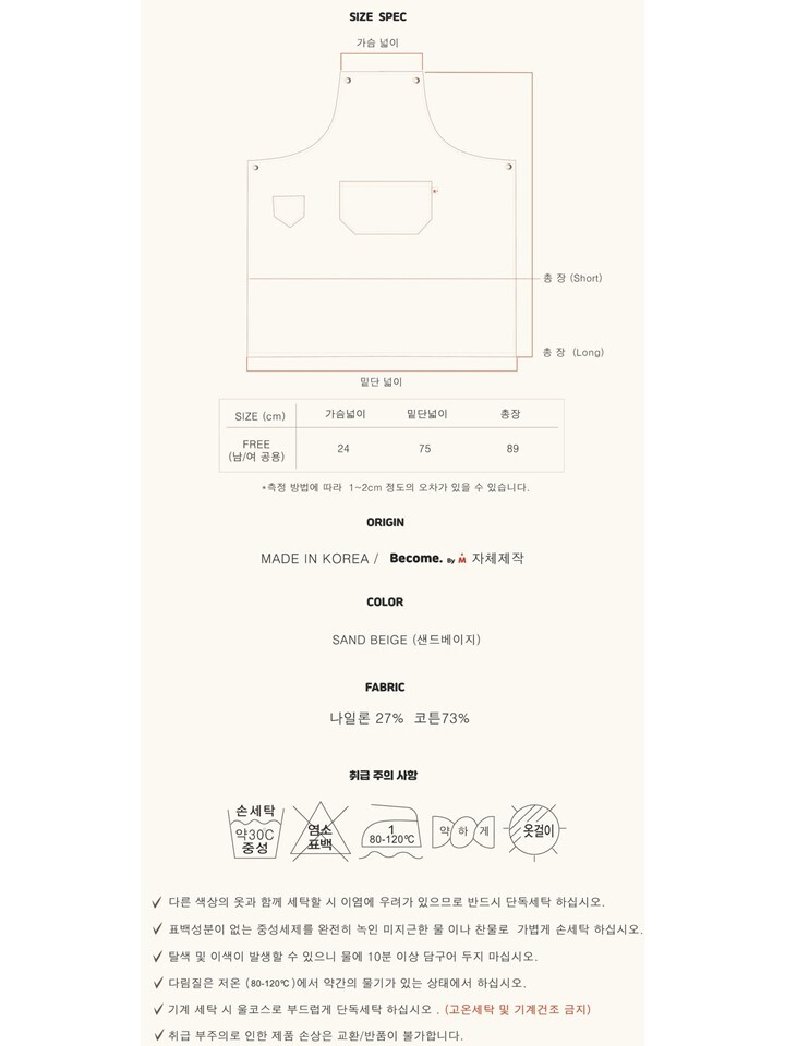 WR(Water Repellent Coating)가공으로 수증기는 배출하고 물방울은 튕겨내서 주방이나 카페에서 착용하시기 좋습니다.